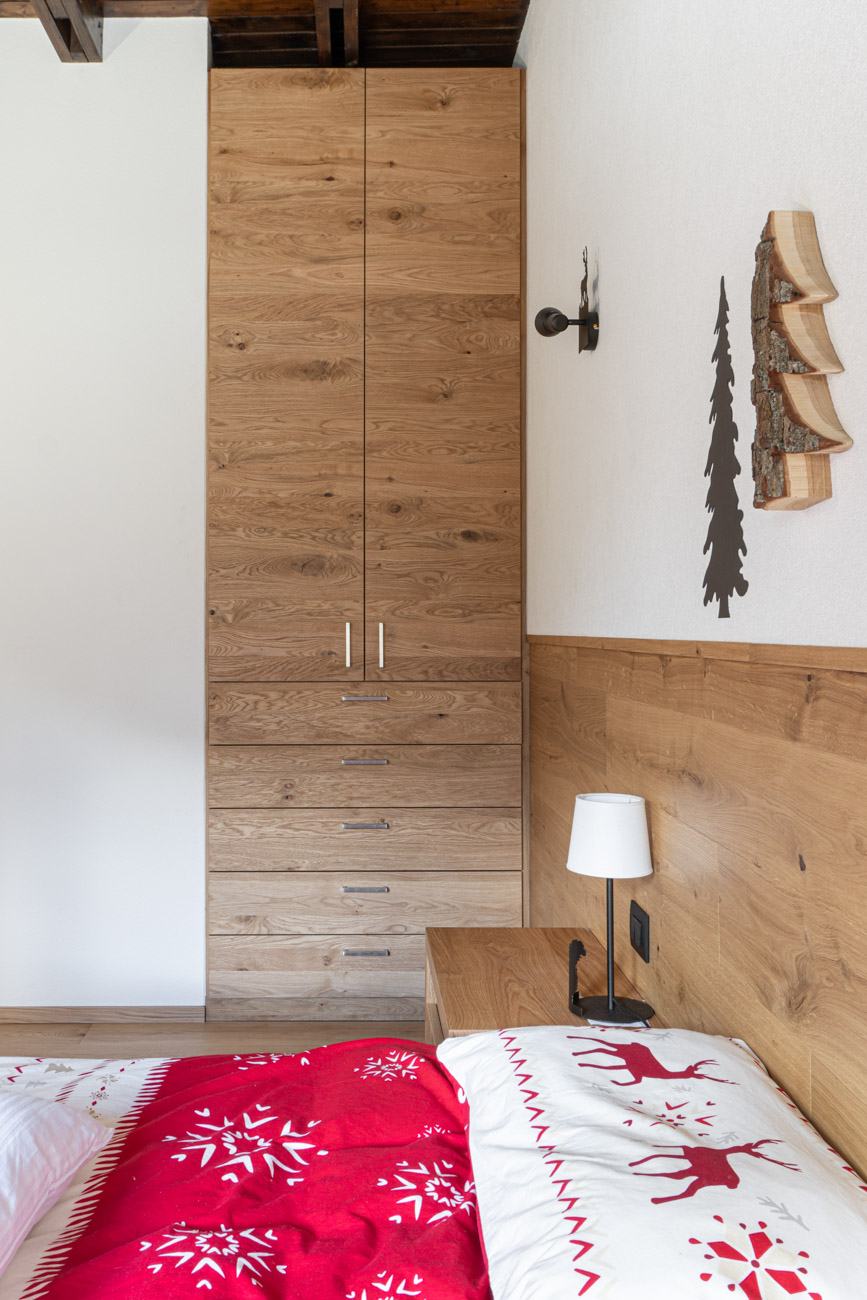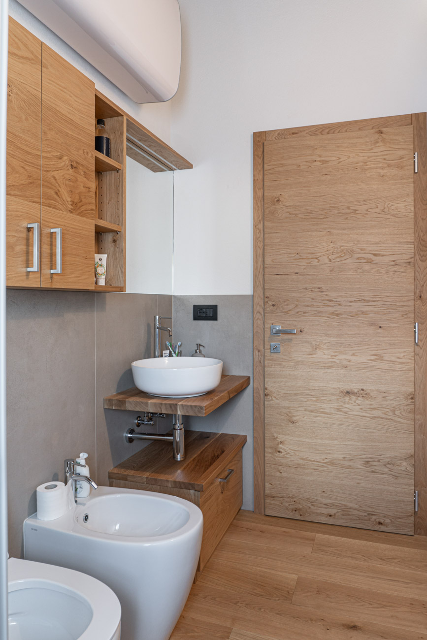 Le linee essenziali e l’eleganza del rovere rustico danno vita ad arredi moderni, per la camera da letto e il bagno di questo appartamento privato.