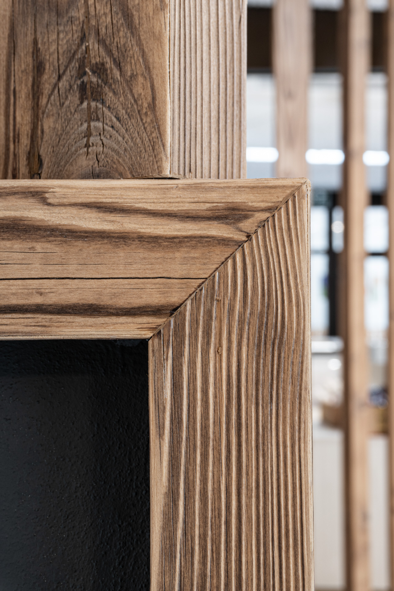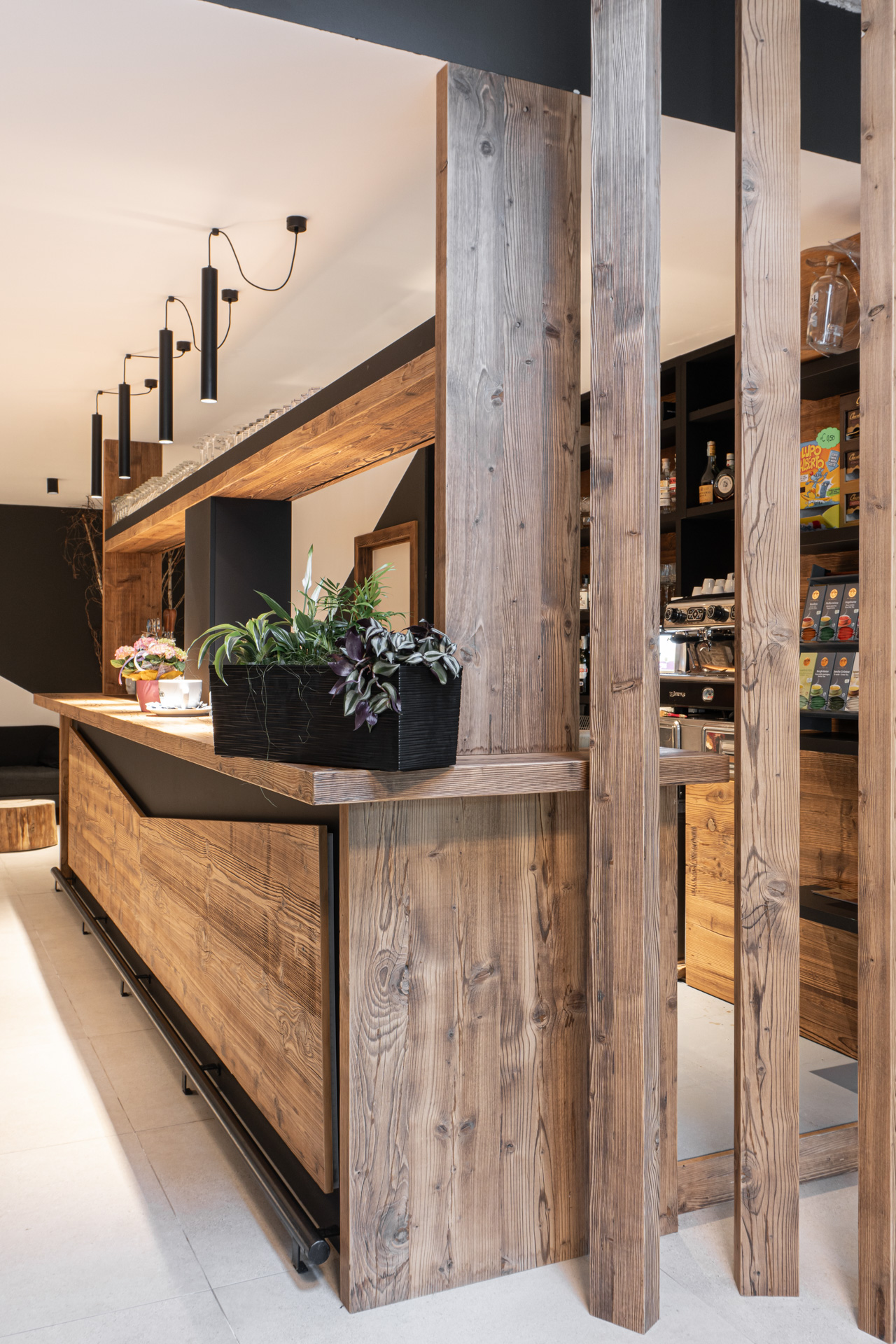 Gli arredi in legno di abete vecchio, con patina marrone scuro, sono abbinati a inserti nero opaco.