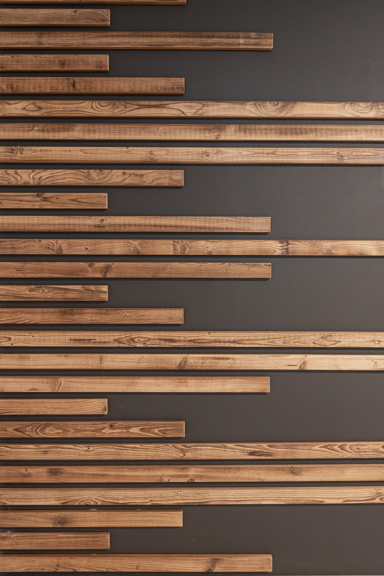 Ampi divani, sedute e tavoli sono disposti in armonia; la parete divisoria a listelli inclinati definisce gli spazi ma lascia intravedere ciò che c’è dietro, mantenendo una continuità visiva.