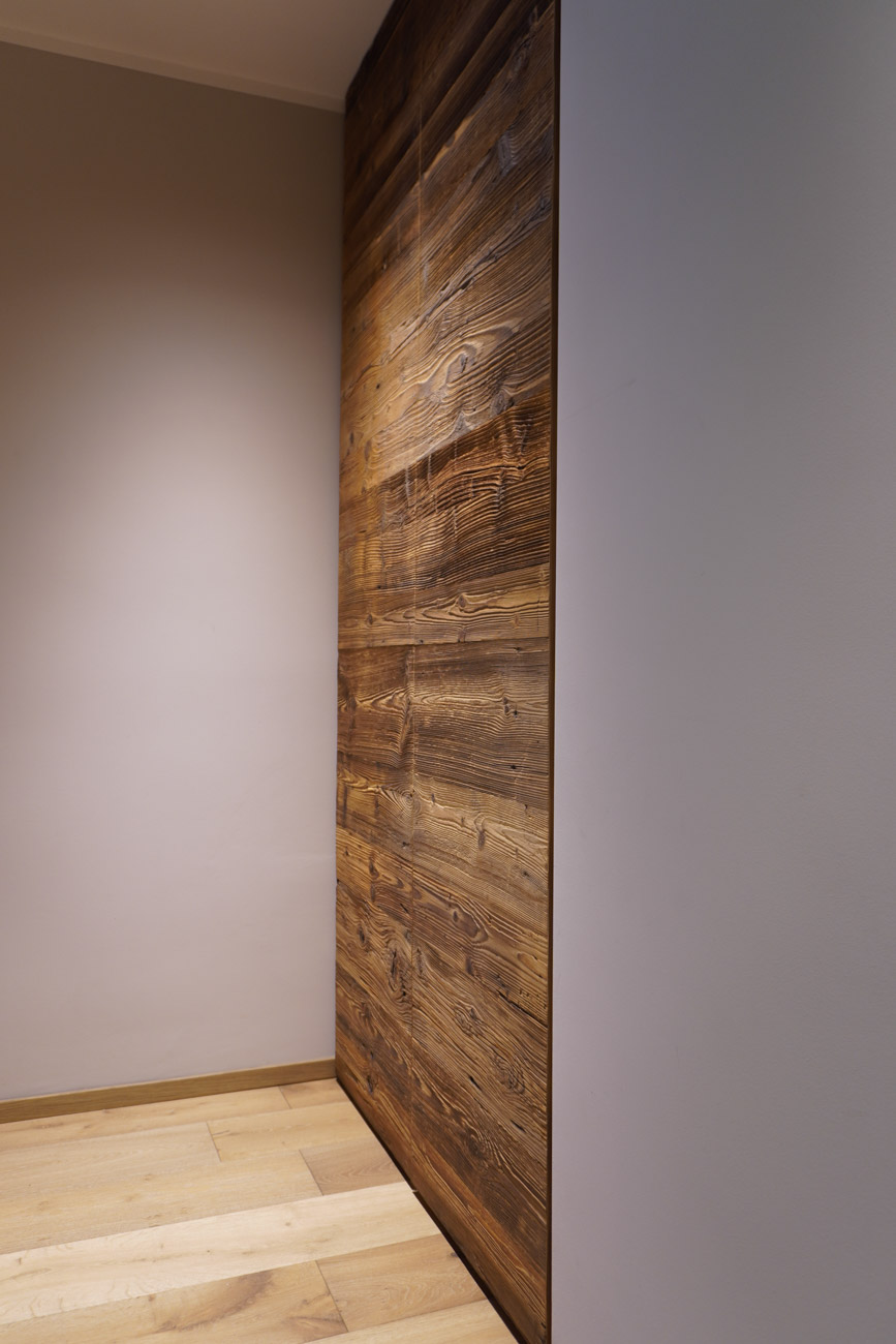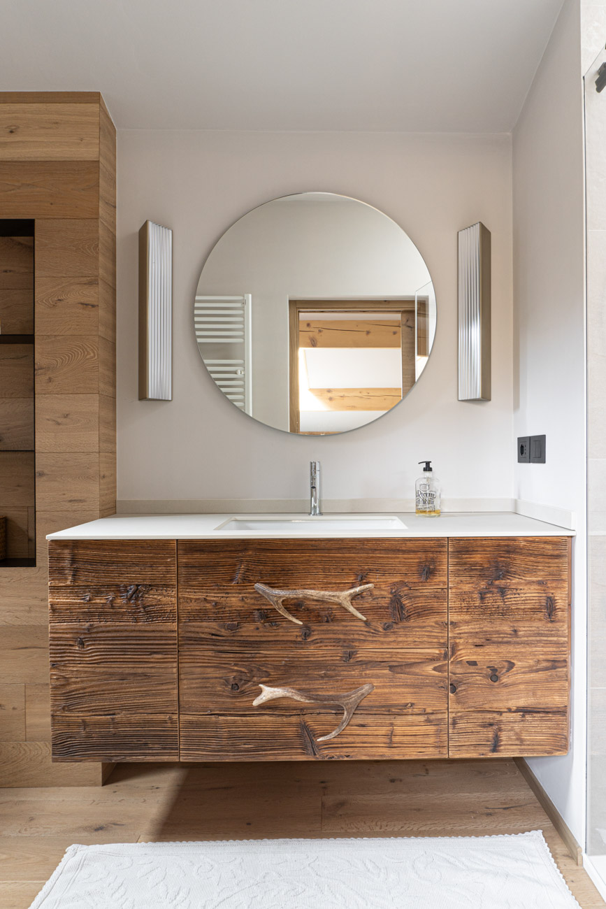 L’accostamento di essenze diverse dà vita a un ambiente pieno di carattere. Rivestimenti e pavimenti in rovere rustico e mobili in abete vecchio, dalla finitura particolarmente materica, grezza. A completare, il top in ceramica della zona lavabo in bagno.
