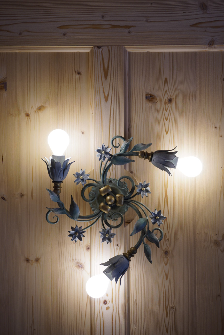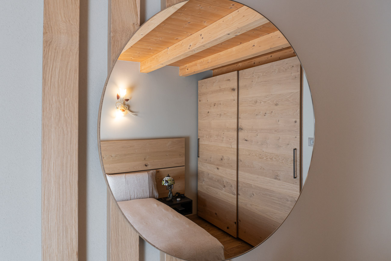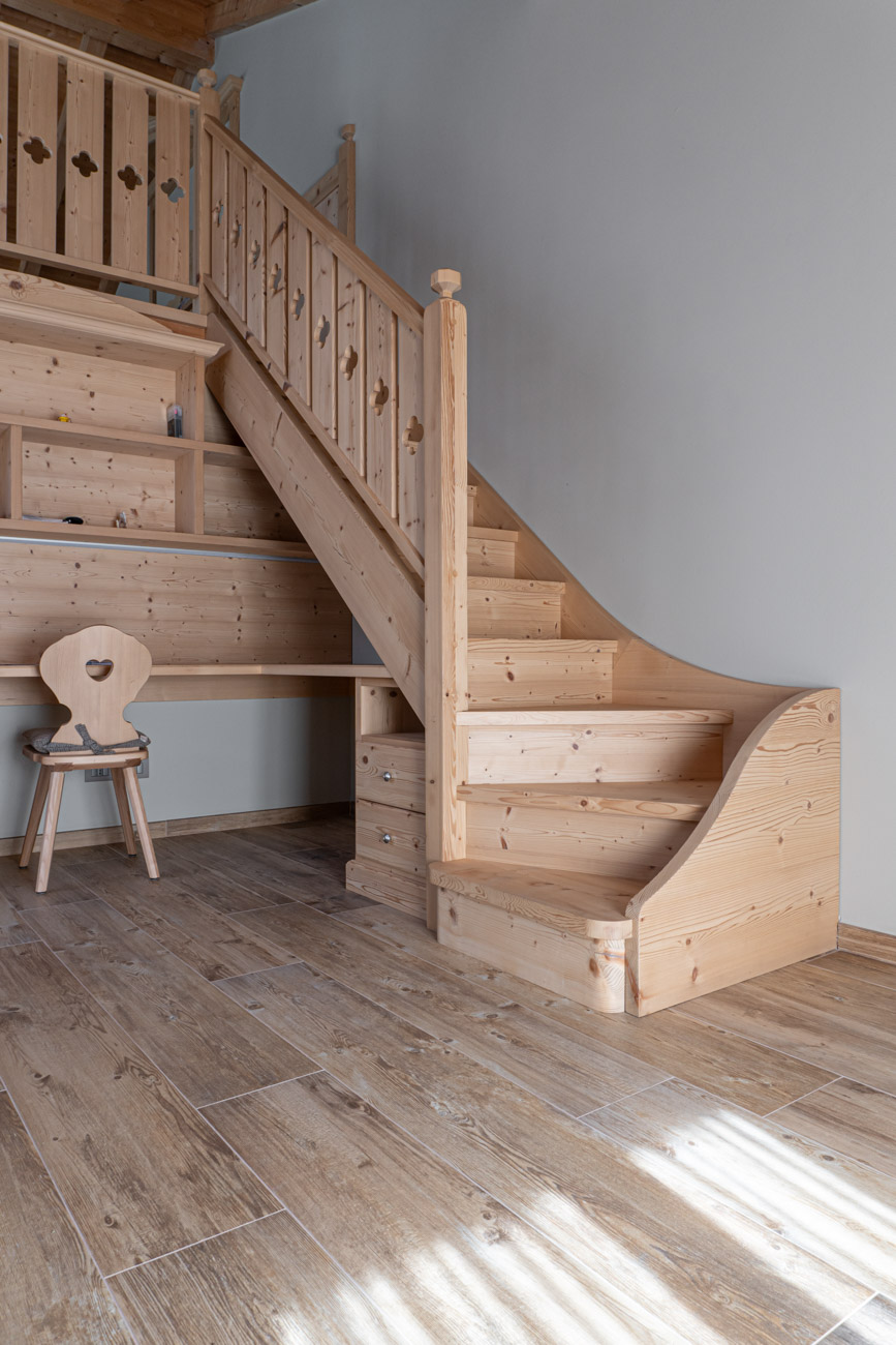 La camera padronale a soppalco si distingue per l’atmosfera fiabesca: ospita forme articolate, decorative e sinuose, unite a preziosi inserti in cristallo. Il pavimento è in rovere rustico e gli arredi in abete anticato. Anche il parapetto della scala d’accesso presenta lavorazioni dal gusto romantico.