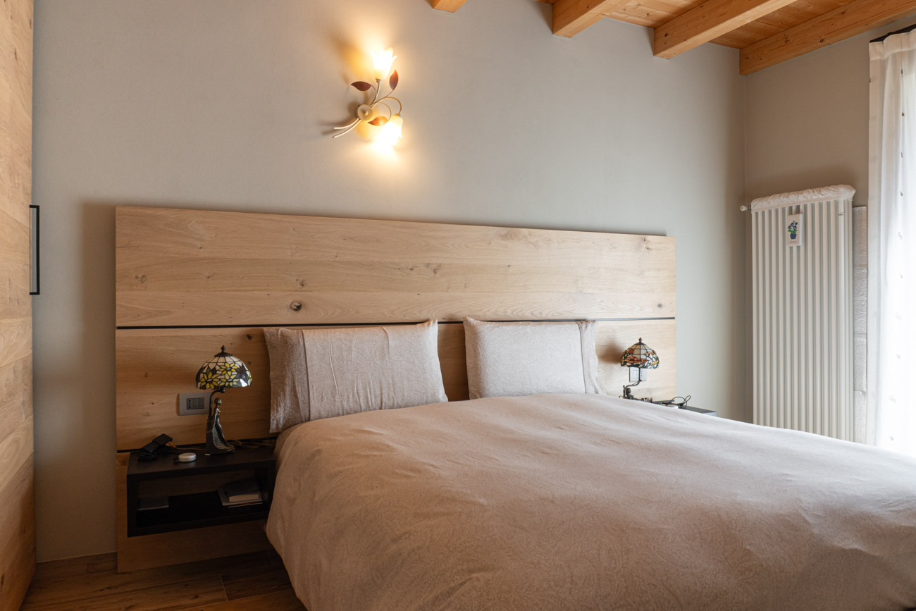 Per la camera matrimoniale, abbiamo abbinato il nero opaco di inserti e dettagli al rovere rustico del pavimento e dei mobili.