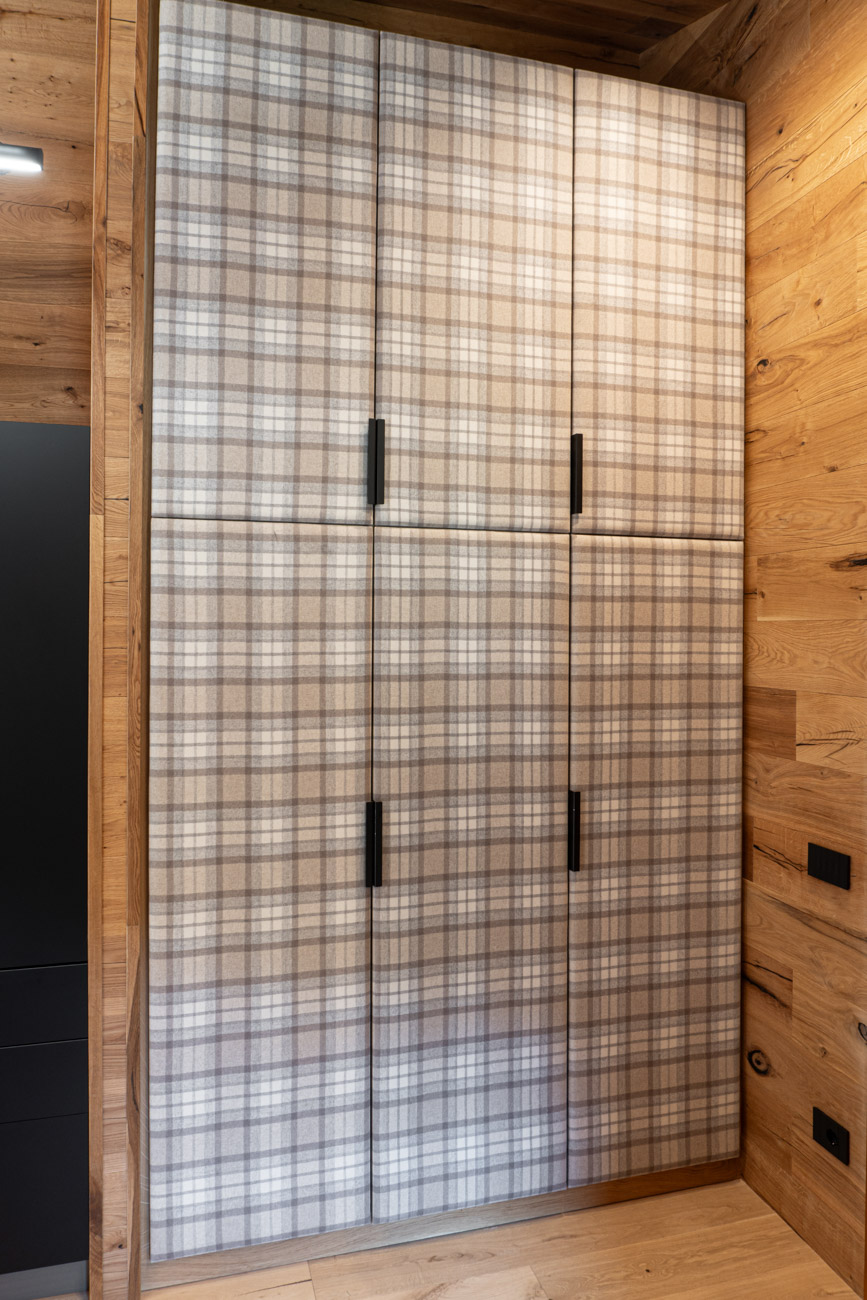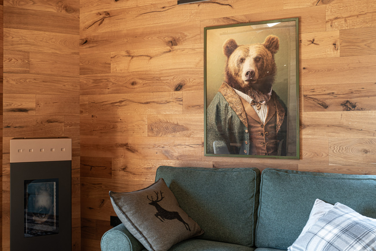 Appartamento completamente rivestito in legno di rovere rustico, con arredi della stessa essenza.